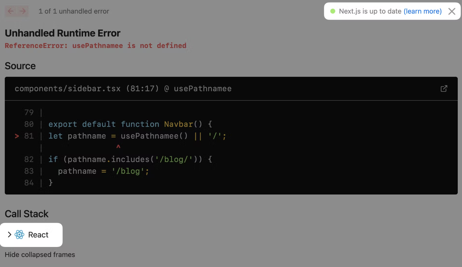 에러가 발생했을때 이 에러가 react에서 발생한건지 next에서 발생한건지 더 직관적으로 알 수 있게끔 UI가 업데이트 됐습니다.